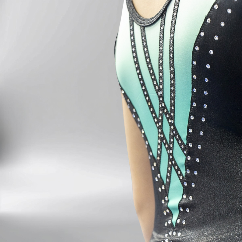 Shine bright in the Turquoise Galaxy Sleeveless Leotard! This striking design features a mesmerizing turquoise gradient across the chest and back, sparkling with delicate diamond accents. The sleek, shiny black Lycra bodice adds a bold contrast, making it a standout choice for training or competition. Comfortable, stylish, and made to inspire confidence in every gymnast—step into the galaxy and let your talent shine!